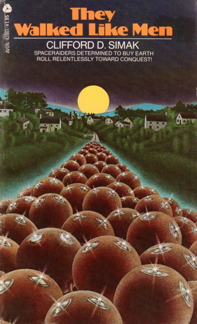So, you can imagine my surprise when I read Simaks 1964 novel They Walked Like Men. I stumbled upon the book on my local library’s web site. It was a modern copy (see the excellent 1979 cover below by Jan Esteves), and I figured that if my librarians like it enough to buy an e-book copy, it must be worth a shot. So, I checked it out. And I loved it. It’s one of the strangest, edgiest sci-fi novels I read in a long time. Imagine an alien invasion narrative, set in the early 1960s, in which the major plot point is…real estate.