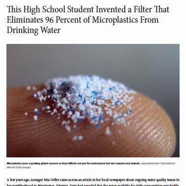 So, whenever I run across a news story like this one about a small, ingenious invention of the sort that might—just might—help get us out of this mess, it warms my heart. And even more so when the inventors are young people. In this case, seventeen-year-old Virginian Mia Heller came up with a new, cheap, reliable way to filter microplastics from water. Her system is based on a type of nanoparticle-infused oil called a ferrofluid, which basically pulls the microplastics out of the water like a magnet. The oil is reusable and easy to make.