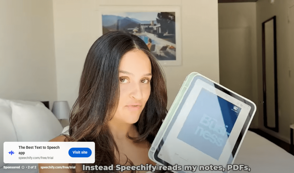 And then, just this morning, in one of those instances of synchronicity that seem to happen fairly often to me (and which I blog about, a lot), I happened to be presented with a YouTube ad (for Speechify, of all things). Before the skip button came up, I had to leave the room, so I paused the ad so I wouldn’t miss the beginning of the actual video I was waiting for. (Just to prove I wasn’t crazy, I did a screen grab, above left.)
