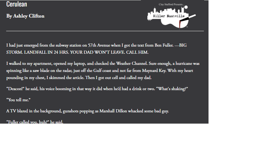 I’m very happy to announce that my short story, “Cerulean”, has been published by Killer Nashville Magazine! Many thanks to Isabelle Kanning and the rest of the editorial staff for accepting it.