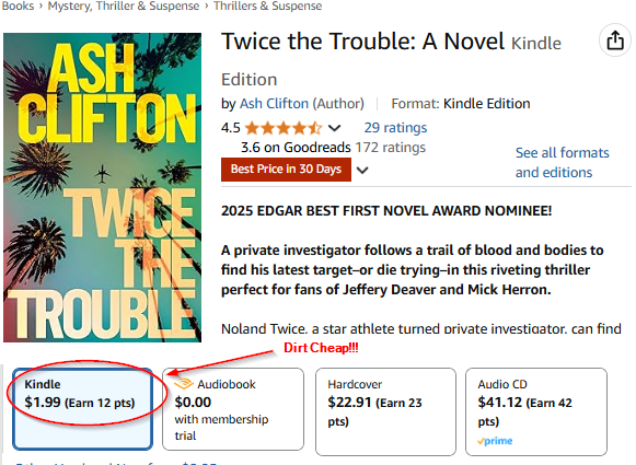 Have I no shame? Not a shred! Therefore, I am letting everyone know that the Kindle edition of my Edgar-nominated novel, Twice the Trouble, is currently on-sale for two Ameros! If you like mystery fiction, or want to support this blog, please buy a copy.
