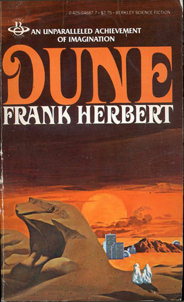 Nonetheless, it’s a great cover. Putting a dune on the cover of Dune might seem like a no-brainer, but Di Fate’s choice here really gives the reader a sense of the book’s setting—the mysterious, pitiless desert planet of Arrakis. And if there was ever a novel where the setting becomes a character in and of itself, it’s Arrakis. The ghostly white figures depicted are obviously Fremen, the fierce native people of the story (never mind the fact that the Fremen in the book where black still-suits and not white robes). The fact that they seem to be crossing out of the desert and into the town is significant, too, because so much of novel involves the intersection of wilderness and civilization (the desert people being more “civilized,” in some ways, than those of the town).